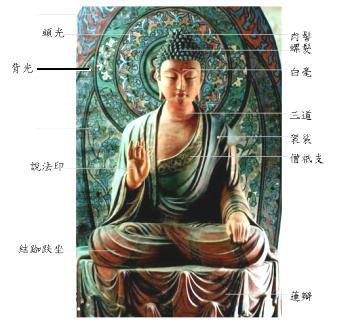 佛的形象一般為出家比丘相,盤腿打坐在蓮花座或方形須彌座上,身披袈裟,頂有肉髻,偏袒右肩,顯露心胸,無寶冠和纓絡(luò)。佛像上有著不同的手印(手指和手指構(gòu)成形狀)。一般而言,佛所穿的衣服,大致是下穿裙衣掩蓋下半身。裙衣沒有帶襻攫,以帶束布而成褶。佛教各派所宗的衣裙及布色略有不同。佛的上身穿“僧祇支”,這是一種從左肩穿至腰下的長形衣片。在僧祇支的外面則穿大衣(梵言稱“僧伽大衣的穿法有通肩和偏袒右肩兩種。)
