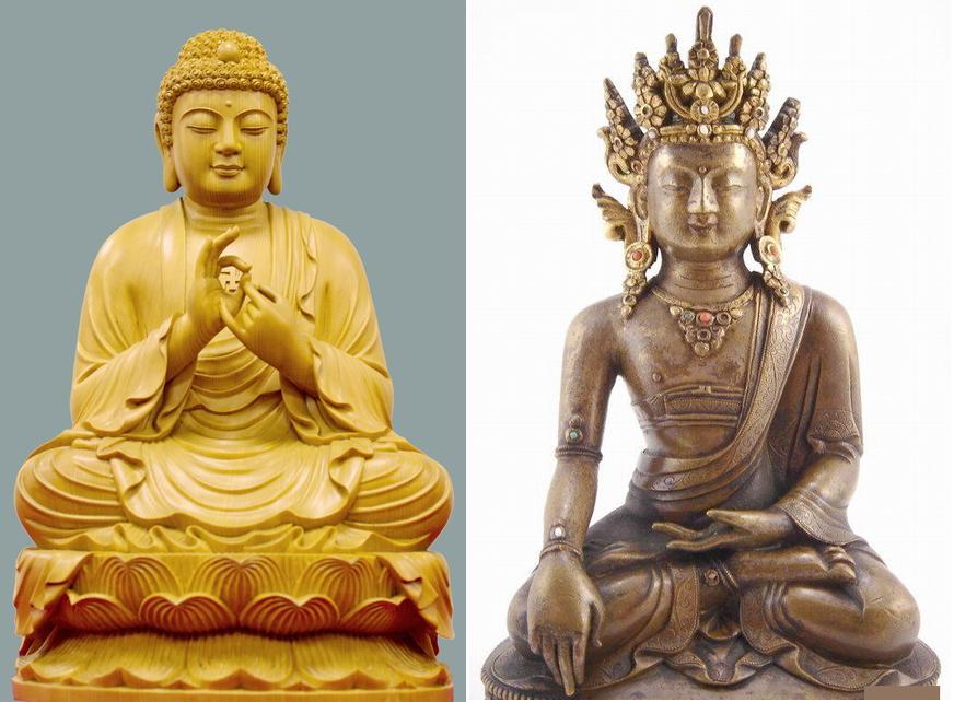 只要是佛的階次,頭上一定有肉髻,有右旋螺發(fā)或水波紋佛發(fā),身著大衣(通肩式、袒右肩式、褒衣博帶式、雙領(lǐng)下垂式等)。例如釋迦佛、旃檀佛像、燃燈佛、彌勒佛、阿彌陀佛、藥師佛、毗盧遮那佛(大日如來)、盧舍那佛等都屬于如來相。