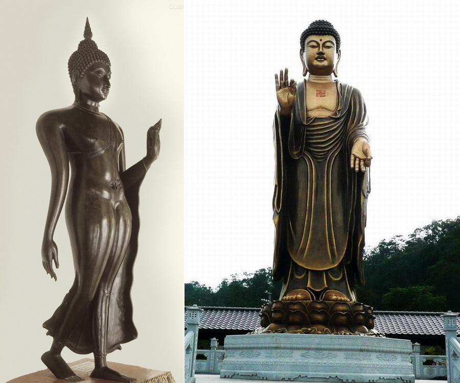 佛立像本于釋迦佛游行說法的姿勢。相傳釋迦成道后,在西北印度各地游行說法四十九年。所以佛的立像多為一腳向側(cè)前略伸,表示步行的樣子,一般稱之為行徑像。還有一種雙腳并立于蓮花臺上,雙手作接引狀,這大多是阿彌陀佛像,表示接引往生西方極樂世界的意思。在尊像旁,有一種站立合掌的菩薩或弟子的像,這稱之為侍立像。此外,各種護法天神的像多為立像,其姿勢則有各種各樣。
