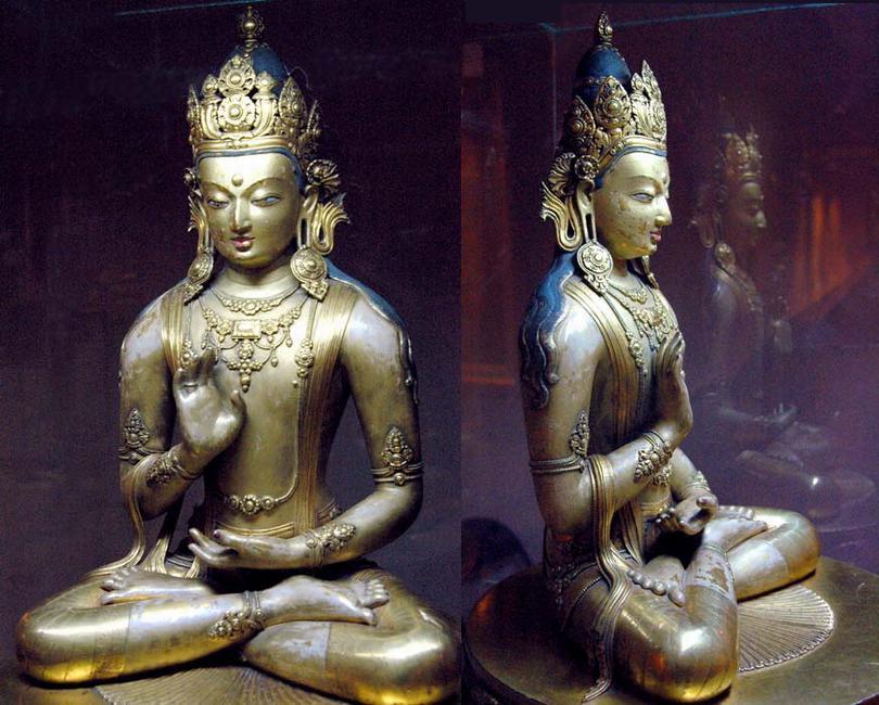 元代統(tǒng)治階級信奉藏傳佛教,但對其它宗教信仰采取寬容態(tài)度,因而傳統(tǒng)的佛教藝術(shù)仍得到繼承和發(fā)展。同時,藏傳佛教密宗,與傳統(tǒng)佛教顯宗并存,使佛教造像亦有增益?!皾h式造像 ”繼承了唐宋傳統(tǒng)風(fēng)格,漢化佛教特征更加明顯;“梵式造像”受到印度巴拉王朝作風(fēng)的影響,有其特定的儀軌,雖與“漢式造像”有些共同點,但從外表形象到內(nèi)在的精神狀態(tài),從面型、體型、姿態(tài)、服飾、執(zhí)物,到背光、蓮座乃至龕形,大多顯露出梵式藏傳佛教造像的特征。到了明代,東傳的“梵式”已與“漢式”融合一起,佛教造像進一步漢化。清代,“梵式造像”與“漢式造像”并存不悖,各領(lǐng)風(fēng)騷。特別是一些鎏金銅造像,制作精美,光彩奪目,有的還鑲嵌珍珠寶石,十分寶貴。
