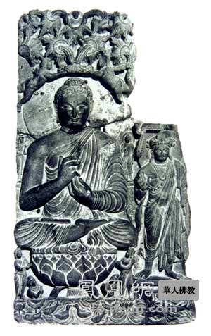 犍陀羅國創(chuàng)始者,原為公元1世紀入主其地的大月氏人(在敦煌附近),后疆域擴大,建都今巴基斯坦的白沙瓦城。這里曾為希臘人長期占領,留下希臘風格的雕塑藝術。犍陀羅人汲取古埃及、希臘、羅馬、波斯的雕刻手法,并加以發(fā)展,形成表現(xiàn)美的比例、和諧的幾何形體和真實、煥發(fā)生命力的人體雕塑藝術。佛像頂上的肉髻,被希臘雕刻常見的優(yōu)美自然的波浪式卷發(fā)所覆蓋,佛像通肩式袈裟,類似希臘羅馬雕刻的長袍,襞褶厚重。面部表情平淡、高貴、冷靜,半閉的眼睛流露出沉思內(nèi)省的神態(tài)。