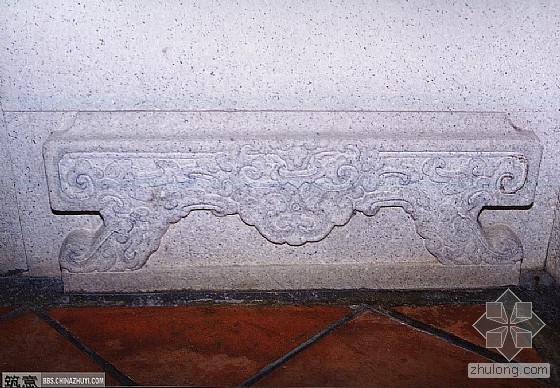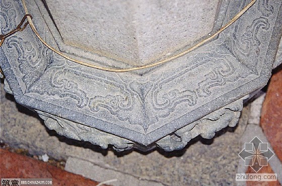 | 圖中左右兩個(gè)壁柱下石作下段也一樣,稍小。和須彌座的圭角一致的是都立于土襯石上。按照劉大可《中國(guó)古建筑瓦石營(yíng)法》標(biāo)準(zhǔn)的須彌座的圭角用如意云。倒是圖中形狀有象龜腳之處;整體應(yīng)該是仿幾案。臺(tái)灣研究閩南古建的學(xué)者稱之為“柜臺(tái)腳”。
