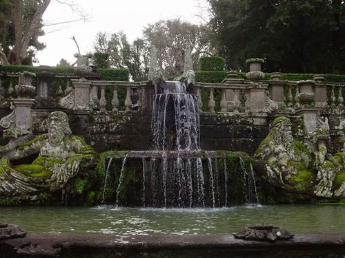 噴泉:蒙塔爾托主教入主別墅時(shí)期,他按照當(dāng)年維尼奧拉的整體設(shè)計(jì),繼續(xù)建造花園的中央噴泉--意大利風(fēng)格主義雕塑家詹博洛尼亞(1529-1608)設(shè)計(jì)建造的"摩爾噴泉":4個(gè)石欄圍繞的水池,石欄上矗立著石雕花瓶,4個(gè)水池中央便是一組高聳的年輕運(yùn)動(dòng)員的輝煌雕塑,他們高高舉起象征著蒙塔爾托主教家族姓氏的"阿爾托山"。從遠(yuǎn)處看去,這些有力的塑像十分宏大,黑黝黝地閃耀,以至于人們會(huì)認(rèn)為它們是青銅,可是難以置信的是,它們是最好的、最堅(jiān)硬的石灰華在陽光與水的作用下生成的一種堅(jiān)硬如鐵的物質(zhì)。后來意大利新古典主義雕塑大師卡諾瓦來到這里時(shí),大為驚訝,他一邊拿起錘子輕輕敲打著它,一邊發(fā)出如此的感嘆:"它將比大理石更長久"。