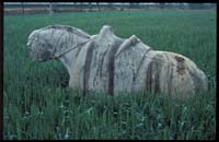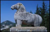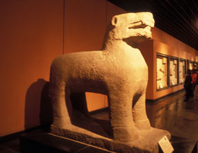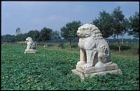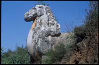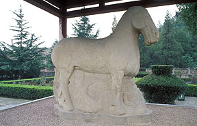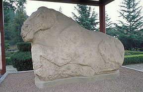 古代陵園石雕遺存實物最早的是引人注目的西漢霍去病墓石雕,作品原在陜西省興平縣漢武帝茂陵東面霍去病墓上與墓前?,F已發(fā)現的石雕作品有造型各異、天趣宛然的動物、人物等共十四件?;羧ゲ槲鳚h名將,漢武帝為表彰其功、紀念其人,于茂陵東面選定其墓址并“為冢象祁連山”,據《史記?衛(wèi)將軍驃騎傳?索隱》記:其墓“冢上有豎石,前有石馬相對,又有石人”。今存作品即記載中的部分原物。它們可以分為兩類,一是通常被稱之為“馬踏匈奴”的立馬,二是其它渚石。立馬的原在位置是墓前不遠,長年來未有大的移動,從形式上看為靜立姿態(tài),尺度適中,符合一般早期墓前石雕的制作規(guī)律,相信此即記載中相對而立的石馬,只是另一件已無存,“石人”也不見了。唐薛逢《漢武帝祠》詩云:“茂陵煙雨埋弓箭,石馬無聲蔓草寒”。詩中所指茂陵石馬當系帝陵制度,但與霍墓立馬的位置及造型表現肯定有直接關系。西漢時期陵園墓前設置石雕已成風氣,關于石人石獸的記載與遺存并不罕見,因此霍去病墓前石馬并非例外,實屬常規(guī)設置,它為我們提供了代所完善的石象生設置與造型形式之源的現知最早實物證據。