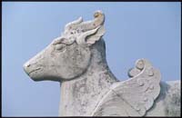 漢代墓葬手段逐漸完善之時,神靈的偶像也大規(guī)模出現,它們體現著人們對神的認識、崇拜和依賴,它被認為會給陵墓帶來吉祥,給墓主靈魂以庇護和幫助,會驅逐鬼怪邪祟。魏晉南北朝時期這種偶像化更為明顯,為后代確定了神靈崇拜的偶像模式。陵園神道兩側列置著石雕天祿辟邪;墓室里陳放著陶塑的鎮(zhèn)墓獸;壁畫描繪著羽人、飛天、神靈;墓門棺槨上也刻劃著方相氏的形象。前代的這種審美表現因素影響著唐陵石雕藝術表現的一個重要方面,即歸結出天馬、天鹿等神靈崇拜的占有一定比例的造型表現部分。末陵石雕的角端、瑞禽明清陵園石雕的麒麟、獬豸等都是這種基礎內容模式的演變。先民們試圖通過陵墓這一特殊的環(huán)境達到人與神的有效溝通,在這個意義上造型手段起著關鍵性作用。陵墓被視為人神共處的理想化的虛幻而可信的環(huán)境,在這里天國、人間、地獄融為一體,形成完整的世界??梢哉f,對神靈的崇拜心理和原始宗教的世界觀是決定墓葬表現形式的重要因素。