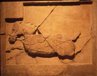 “昭陵六駿”,與其說是表現雕刻的美不如說是表現繪畫的美。據記載,昭陵是在杰出美術家閻立德主持下修建的,并由其弟閻立本圖繪十四國君長像為石刻范本?,F存十四國君長像頭部殘塊顯示的確有寫真特征,面部皺紋用線刻形式加以表現,甚至眼角的紋路亦不放過,形象追求“寫真性”,突出個人的容顏特點,在某種程度上帶有一定的摹刻繪畫性,不同于一般的石人?!傲E”所表現的是唐太宗征戰(zhàn)慣用的六匹戰(zhàn)功馬,宋游師雄題《六駿碑》中記述了石刻當時安置的次序:颯露紫(西第一)、特勒(勤)驃(東第一)、拳毛馬咼 (西第二)、青騅(東第二)、白蹄烏(西第三)、什伐赤(東第三)?!傲E”表現為類似于漢畫象石刻中浮雕的形式,在方形外框中刻畫馬的側面形象,韻致非常接近于唐代繪畫中馬的表現。“六駿”是具體指象,即“刻石為常所乘破敵馬六匹”(《唐會要?卷二十》),有形象的特定要求,而且選擇了戰(zhàn)馬中箭、奔馳、療傷的情節(jié)并刻畫出了馬頸部的“三花紋”這類細節(jié)。這都宜于繪畫表現而不宜于圓雕表現。既然人像石雕可以繪畫為范本,馬的石雕當然也完全可能以繪畫為范本。昭陵沒有效法圓雕形式表現鞍馬,原因之一就在于類似畫象石的浮雕形式更便于傳達繪畫性表現內容,避免圓雕所受的材料限制,從而傳達“六駿”特有的紀實性審美意味。