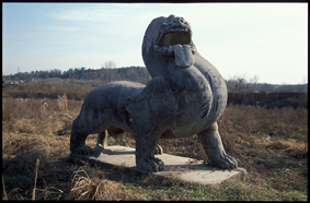 中原地區(qū)從戰(zhàn)國秦漢興起的在墓前設置石雕人物、動物雕像的風氣在唐代已經波及到少數民族居住地區(qū),但由于各自不同的生存環(huán)境、文化傳統、生活方式及受到外來文化影響程度等原因,石雕作品的內容與形式和中原密切聯系的同時又有明顯差異。位于吉林省敦化縣的渤海國前期王族墓地現存石獅兩尊,造型與中原唐陵早期作品十分相似,同時不失北方部族藝術的雄渾質樸風氣,顯示了中原文化的明顯滲透。