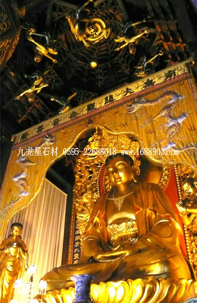 九龍殿:可以說是普陀山上龍文化的集大成之杰作。此殿在清康熙三十八年建成后,世稱“宏制巧構,甲于東南”,名聞天下。據史料記載,清康熙四年,普陀山曾遭荷蘭殖民主義者侵占和掠奪,法雨寺殿宇被毀。三十八年經康熙恩準,將金陵故宮的琉璃瓦和舊殿九龍藻井拆遷于此,故而此殿的來歷不同凡響。為目前國內寺院建筑中規(guī)模最高的一座佛殿,亦是法雨寺的主殿。九龍殿的特點,重檐黃瓦,宏偉深廣,殿頂內槽九龍藻井,穹窿成拱形,一龍盤頂,八龍環(huán)繞八根垂柱懸空而下,昂首舞爪,搶抓居中懸掛的琉璃燈,形成九龍搶珠之勢。其造型之生動,工藝之精巧,堪稱普陀一絕。在九龍殿中還有48根柱磉,均為透雕蟠龍,隆鼻斜眼,張發(fā)伸爪,各呈異態(tài),更使九龍殿增添了龍文化的風韻和色彩。 也許是九龍殿的名氣太大了,歷代名人或文人所寫的楹聯、匾額、詩詞頗多,亦可能是歷代名人的眾多作品,因此進一步提高了九龍殿的知名度,或許兩者兼而有之。如新編的《普陀山志》的楹聯篇中寫九龍殿的就有七條,占法雨寺佛殿之首。其中有菲律賓華僑葉健民、施佩君合家敬獻的“天華降錦屏,九龍殿中騰光輝;法雨潤靈鷲,白華山上顯感應”,此為代表作之一。清朝金土奎的詩《法雨寺》中亦有“九龍殿已偕山老,五門對海雄”等吟九龍殿的詩句等等,可見九龍殿影響之大。