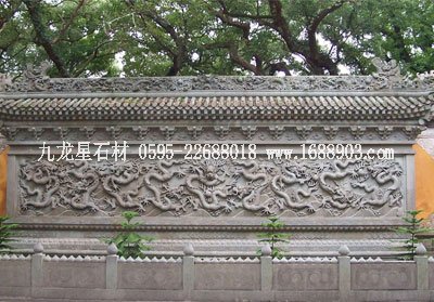 九龍壁:在法雨寺天王殿對面照墻處,1988年由溫嶺縣長嶼鎮(zhèn)民間石雕工匠梁宗濤等人用質地優(yōu)良的青石板精雕細刻而成。它是仿照北京故宮九龍壁,卻又不同于故宮、大同等地的陶制九龍壁。法雨寺九龍壁是用60塊70厘米見方的優(yōu)質青石,精雕細鑿,拼接而成。有的石板上是半個龍頭,有的石板上是一只龍角,有的石板上是一只龍爪,拼接起來竟然不露縫隙,像是在一塊青石上雕刻而成。這不僅有濃厚的刀味,石趣,更顯示了民間雕匠的高超工藝。此座九龍壁高2米,長12米,浮雕凸出16厘米。九條青龍騰飛于云山碧海之間,盤旋翻滾,爭奪龍珠,造型逼真,栩栩如生,富有立體感。而在梁與梁之間還雕有十七條造型各異的小龍,昂首舞爪,十分生動,更使這九龍壁群龍盤舞,似有龍將破壁,呼之欲出之感。此壁于1987年由香港同胞捐建。壁的東側還立有《新建九龍壁功德碑》,碑文曰:“法雨寺原有照壁,前有石牌檔,以條石和塊石為之?!虻鬲M樹大不相稱,始新建九龍壁,取龍?zhí)鞊碜o之說,且又與九龍殿相對稱,”云云。