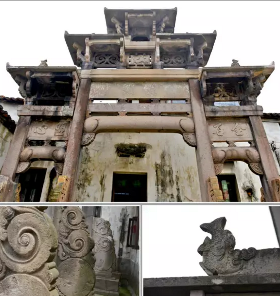 祠建于明嘉靖二十七年(1548),由大理寺卿前右副都御史虞守愚立。大門采用單間石雕牌樓門,門梁兩頭雕卷草如意紋作為邊框,中間的重檐歇山樓閣式建筑象征龍門,龍門下端祥云托護(hù),龍門右側(cè)翻波逐浪,騰蛟起舞,一條巨龍騰云駕霧而來,四周祥云繚繞。龍門左邊麗日高懸,水波浪以陰線刻束絲波紋、齒形浪紋,三尾鯉魚在海浪中躍躍欲試,半個(gè)身子露出水面。其中一條鯉魚前半身已躍過龍門,成為龍首魚身的鰲魚,與右邊的蛟龍呈呼應(yīng)姿勢(shì),是典型的魚化龍題材。民間以登科及第比喻鯉魚跳龍門,表達(dá)出古代科舉制度下讀書人對(duì)布衣卿相的渴望。門額上方的龍門枋淺浮雕琴、簫、書、畫等圖案。