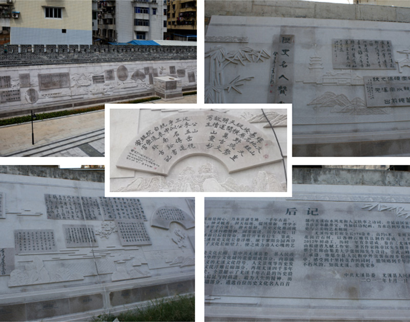 浮雕墻設(shè)計(jì)內(nèi)容:1、尤溪賦;2、歷史文化墻為:拓土開疆、高伏獻(xiàn)圖、開元建縣、盧珖守城、宋咸治縣、林積還珠、沈括謫尤、金屬冶煉、韋齋舊治、一代宗師、重教興學(xué)、居敬孝道、凌輝治吏、田頊博學(xué)、詹榮護(hù)國(guó)、瓜瓞聯(lián)芳、譫思為政、民俗風(fēng)情、紅軍入境、淞滬請(qǐng)纓、和平解放、山鄉(xiāng)巨變、走向未來(lái)