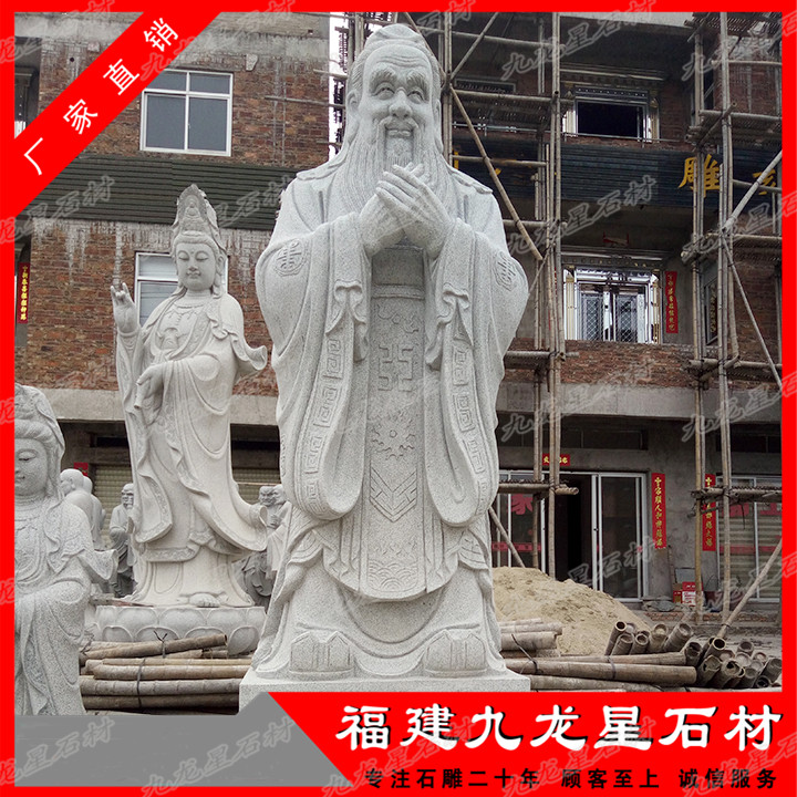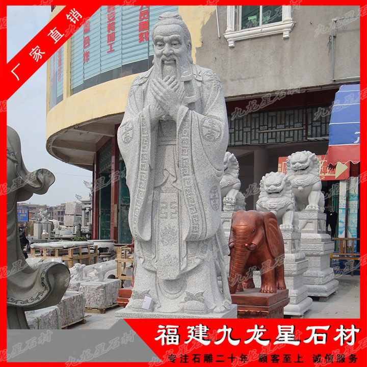 孔子石雕像樣式選擇性不算太大,現(xiàn)在我們看到的孔子形象大多是根據(jù)唐朝的吳道子所畫的孔子像來進(jìn)行創(chuàng)作雕刻的,長眉長須,身著寬大的儒服,衣袂飄飄,栩栩如生,因此非??简?yàn)雕刻師傅的工藝,達(dá)到石雕像的真實(shí)感,表情惟妙惟肖。一般比較常見的孔子石雕像有比較簡單的頭像,也有站姿的石雕像,基本上站立姿勢的石雕像選擇性更受到人們喜愛,有手里握著書卷拿在胸前,一手背在身后,抬頭挺胸,眼神眺望的石像,也有將雙手交叉并在胸前,但是我們可以看到交疊的手是不露出大拇指的,象征著謙恭有禮,而四指并攏,也代表著四海之內(nèi)皆兄弟,有著友愛、友誼的象征意義。